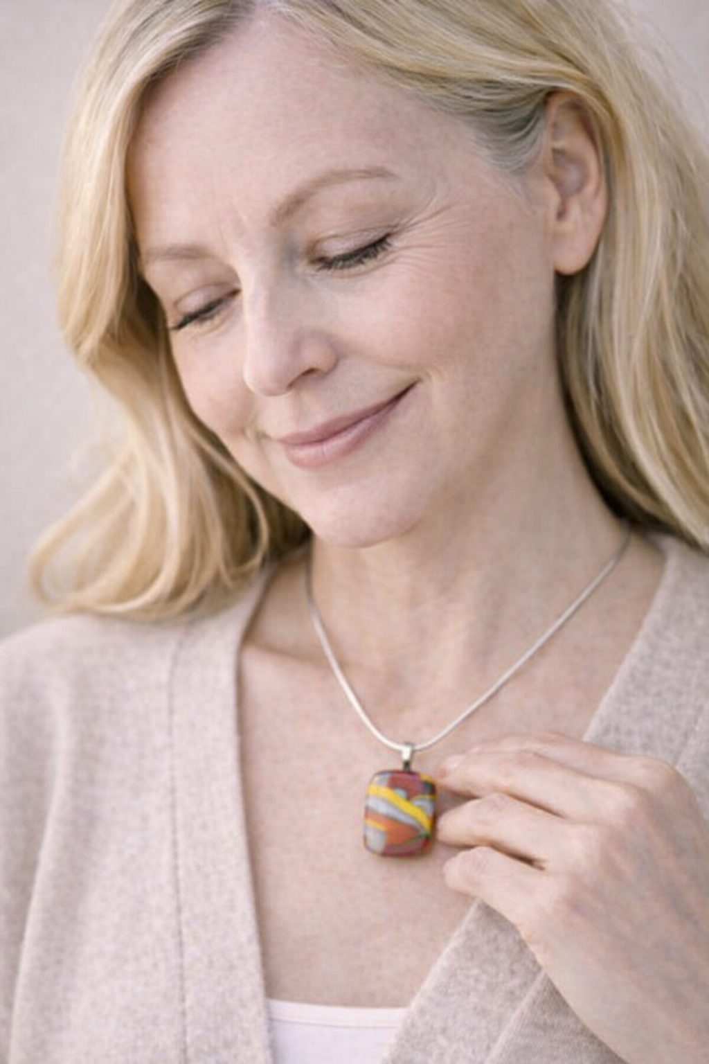Each Stoney Lake Glassworks pendant is individually crafted, making this piece truly one-of-a-kind. The flowing swirls create depth and dimension, while the warm color palette makes it a versatile statement piece that complements any style.
