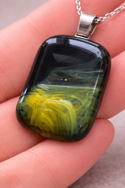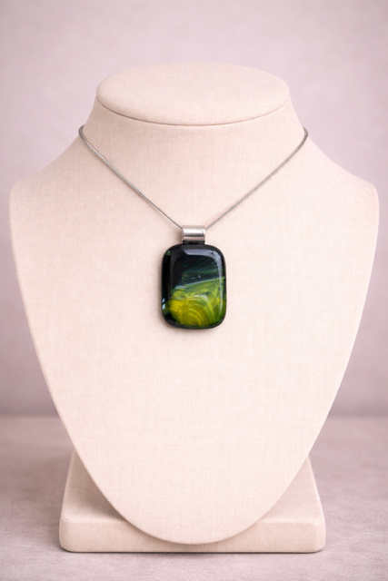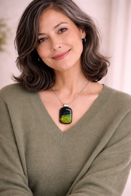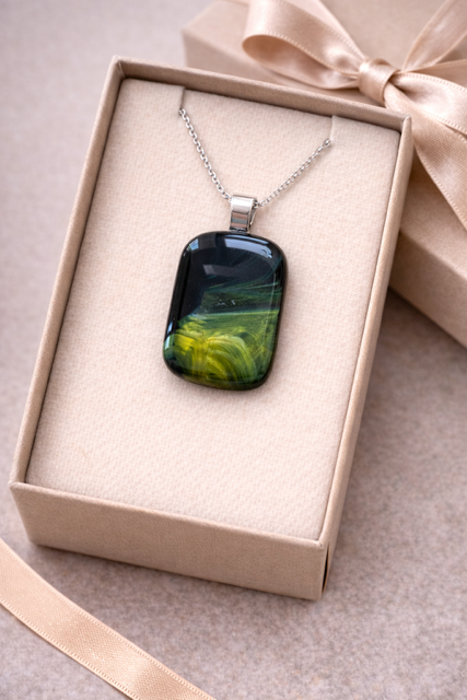 The Emerald Night pendant is bold, mysterious, and utterly captivating. Deep black glass is alive with swirling shades of emerald green — rich, luminous, and wild — like light dancing through a dark forest canopy. This is a piece that commands attention and tells a story with every glance.