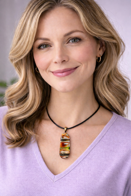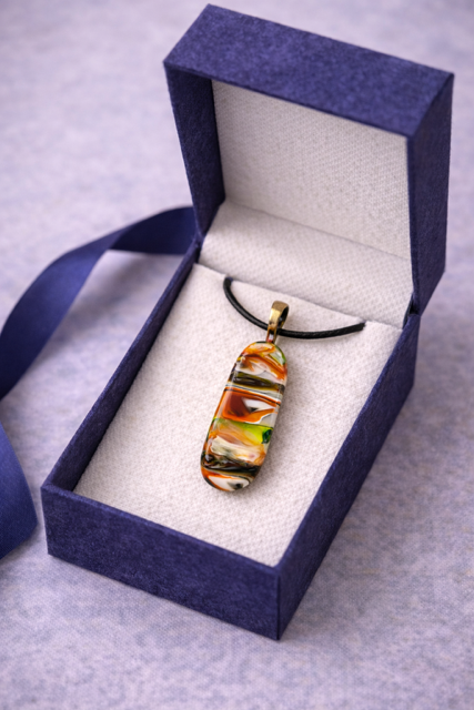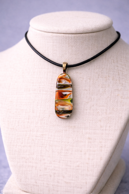 The Tortoise Shell pendant takes one of nature's most iconic patterns and renders it in luminous handcrafted glass. Rich bands of black, warm brown, and burnished copper layer over a clear glass base, creating a depth and translucency that makes the piece glow from within. Classic, sophisticated, and endlessly wearable.