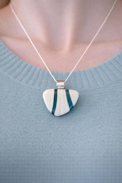Its compact guitar pick silhouette is modern and versatile, with a smooth polished surface and a satisfying weight in the hand. Finished with a sleek silver cylindrical bail, it pairs beautifully with white, cream, navy, and earthy greens. Handcrafted at Stoney Lake Glassworks, each piece is individually made — no two are ever alike.