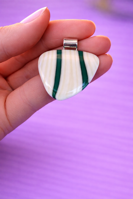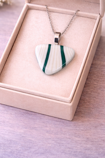Fairway is a strikingly graphic handcrafted fused glass pendant that pairs the softness of pearl white with the boldness of deep forest green. Two clean vertical stripes of rich green run through the luminous white base with quiet precision — bold enough to notice, refined enough to wear anywhere.